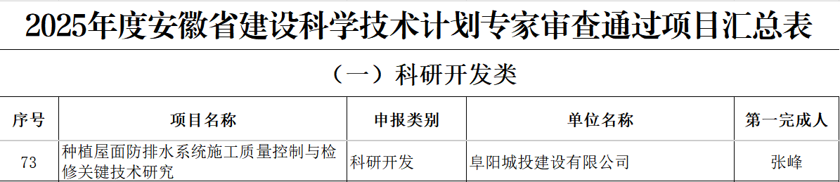 近日,安徽省住房和城鄉(xiāng)建設廳公示了2025年度安徽省住房和城鄉(xiāng)建設科學技術計劃項目名單,城建公司牽頭承擔的種植屋面防排水系統(tǒng)施工質量控制與檢修關鍵技術研究成功入選。